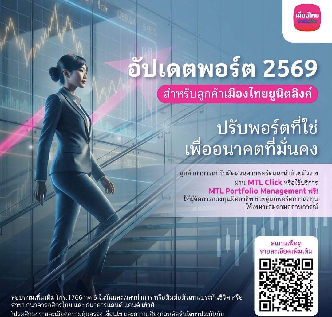 ทั้งนี้ ลูกค้าเมืองไทยยูนิตลิงค์ mDesign, mGrow 615, mOne และ mOnePlus สามารถปรับสัดส่วนการลงทุนตามพอร์ตแนะนำใหม่ด้วยตัวเองผ่านแอปพลิเคชันMTL Click สำหรับลูกค้าที่ไม่มีเวลาบริหารจัดการพอร์ตการลงทุน สามารถสมัครใช้บริการ MTL Portfolio Management เพื่อให้ทีมผู้จัดการกองทุนมืออาชีพคอยติดตามดูแลพร้อมทั้งปรับพอร์ตการลงทุนยูนิตลิงค์แบบอัตโนมัติให้เหมาะสมตามสถานการณ์ เพื่อเป้าหมายการวางแผนการเงินในระยะยาว นอกจากนี้ บริษัทฯ ยังมีทีม MTL Portfolio Consultants ที่พร้อมให้คำปรึกษา และร่วมวางแผนทางการเงินระยะยาวไปกับทุกท่าน ผู้สนใจสามารถติดต่อตัวแทนเมืองไทยประกันชีวิต หรือสอบถามข้อมูลเพิ่มเติมได้ที่ Call Center 1766