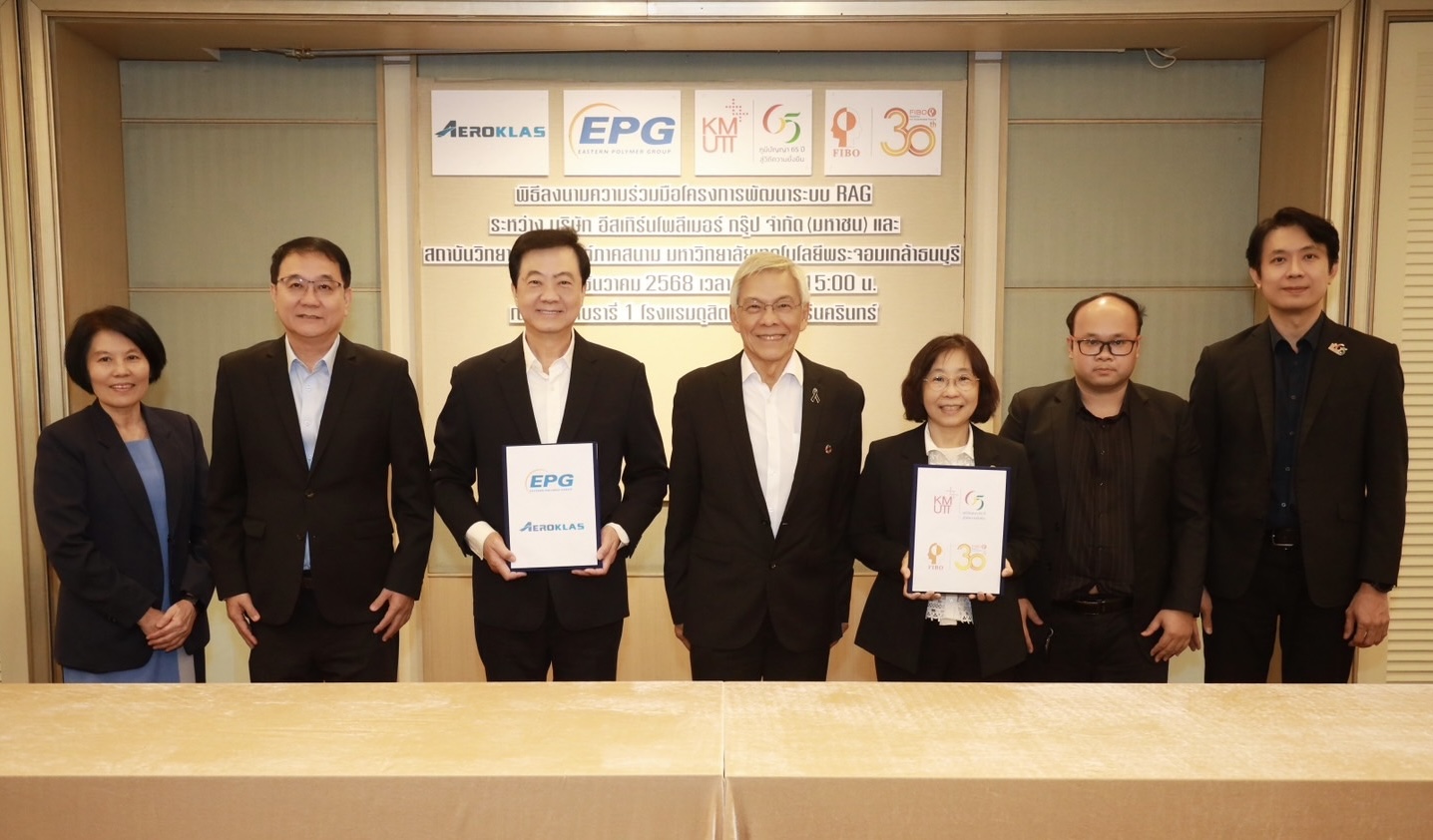 บริษัท อีสเทิร์นโพลีเมอร์ กรุ๊ป จำกัด (มหาชน) หรือ EPG ผู้ผลิตและจำหน่ายผลิตภัณฑ์โพลีเมอร์และพลาสติกแปรรูปชั้นนำของโลก รุกก้าวสำคัญสู่ยุคดิจิทัลด้วยการลงนามความร่วมมือ MOU กับสถาบันวิทยาการหุ่นยนต์ภาคสนาม (FIBO) มหาวิทยาลัยเทคโนโลยีพระจอมเกล้าธนบุรี (KMUTT)   เพื่อร่วมกันพัฒนาโครงการพัฒนาระบบ RAG (Retrieval-Augmented Generation) ซึ่งเป็น AI ขั้นสูง มาใช้บริหารจัดการองค์ความรู้ภายในองค์กร ความร่วมมือครั้งนี้มุ่งเน้นการเพิ่มประสิทธิภาพการทำงาน ลดต้นทุน และเสริมขีดความสามารถทางการแข่งขันในระยะยาว โดย EPG วางเป้าหมายที่จะขยายผลการใช้งานระบบดังกล่าวไปยังบริษัทย่อยเพื่อขับเคลื่อนวิสัยทัศน์ "องค์กรแห่งนวัตกรรมที่สร้างสรรค์ขับเคลื่อนการเติบโตอย่างยั่งยืน ด้วยการใช้ข้อมูลและองค์ความรู้อย่างชาญฉลาด”