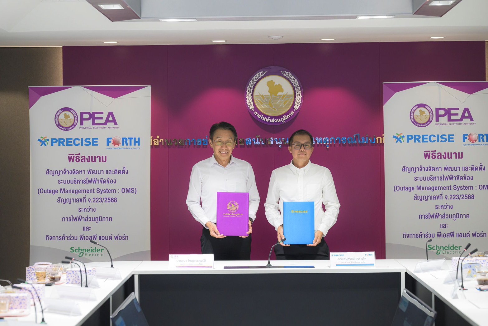 พิธีลงนามสัญญาฯ ได้รับเกียรติจาก นายธนะโชค พรสมบัติ รองผู้ว่าการปฏิบัติการระบบไฟฟ้า การไฟฟ้าส่วนภูมิภาค (กฟภ.) เป็นประธานในพิธีร่วมลงนามกับ ตัวแทนจากกิจการร่วมค้า พีเอสพี แอนด์ ฟอร์ท นายอนุศาสน์ วรรณโท ประธานเจ้าหน้าที่ปฏิบัติการสายธุรกิจ บริษัท พรีไซซ ซิสเท็ม แอนด์ โปรเจ็ค จำกัด โดยภายในงานมีผู้บริหารและตัวแทนบริษัทชั้นนำร่วมเป็นพยานในพิธี ดังนี้ นายมงคล ตั้งศิริวิช ประธาน ชไนเดอร์ อิเล็คทริค ดูแลกลุ่มคลัสเตอร์ ประเทศไทย ลาว และเมียนมา, นายคเณศ สถิตกิจพิเชษฐ์ ผู้จัดการฝ่ายรัฐกิจสัมพันธ์ ชไนเดอร์ อิเล็คทริค, นายธิติ วังศโรจน์ ผู้จัดการฝ่ายดูแลลูกค้ารายใหญ่ (กลุ่มธุรกิจสาธารณูปโภค) ชไนเดอร์ อิเล็คทริค, นายภาสกร นราบริรักษ์ ประธานเจ้าหน้าที่บริหารสายธุรกิจ บริษัท พรีไซซ ซิสเท็ม แอนด์ โปรเจ็ค จำกัด, นายวิชัย ยิ่งจอหอ ประธานเจ้าหน้าที่ฝ่ายเทคโนโลยี บริษัท พรีไซซ ซิสเท็ม แอนด์ โปรเจ็ค จำกัด, นายพัทธนันท์ อมตานนท์ รองประธานบริหารสายงานพัฒนาธุรกิจ บริษัท ฟอร์ท คอร์ปอเรชั่น จำกัด (มหาชน), นายสุรินทร์ อินทร์แจ้ง ผู้จัดการฝ่ายพัฒนาระบบเครือข่าย บริษัท ฟอร์ท คอร์ปอเรชั่น จำกัด (มหาชน), นายกันหา สีหานาม ผู้ประสานงานโครงการ บริษัท ฟอร์ท คอร์ปอเรชั่น จำกัด (มหาชน) พร้อมด้วยคณะผู้สังเกตการณ์ตามโครงการข้อตกลงคุณธรรม